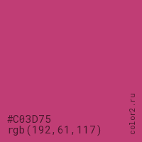 Цвет #C03D75 в цветовой модели RGB обозначается тремя октетами (192, 61, 117) в десятичном формате и #C03D75 в шестнадцатиричном (hex) формате, которые являются интенсивностью красного 192 (hex C0), интенсивность зелёного 61 (hex 3D) и интенсивность синего 117 (hex 75).