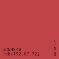 Цвет #C04348 в цветовой модели RGB обозначается тремя октетами (192, 67, 72) в десятичном формате и #C04348 в шестнадцатиричном (hex) формате, которые являются интенсивностью красного 192 (hex C0), интенсивность зелёного 67 (hex 43) и интенсивность синего 72 (hex 48).