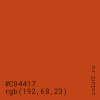 Цвет #C04417 в цветовой модели RGB обозначается тремя октетами (192, 68, 23) в десятичном формате и #C04417 в шестнадцатиричном (hex) формате, которые являются интенсивностью красного 192 (hex C0), интенсивность зелёного 68 (hex 44) и интенсивность синего 23 (hex 17).