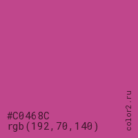 Цвет #C0468C в цветовой модели RGB обозначается тремя октетами (192, 70, 140) в десятичном формате и #C0468C в шестнадцатиричном (hex) формате, которые являются интенсивностью красного 192 (hex C0), интенсивность зелёного 70 (hex 46) и интенсивность синего 140 (hex 8C).