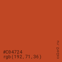 Цвет #C04724 в цветовой модели RGB обозначается тремя октетами (192, 71, 36) в десятичном формате и #C04724 в шестнадцатиричном (hex) формате, которые являются интенсивностью красного 192 (hex C0), интенсивность зелёного 71 (hex 47) и интенсивность синего 36 (hex 24).