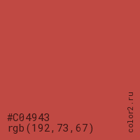 Цвет #C04943 в цветовой модели RGB обозначается тремя октетами (192, 73, 67) в десятичном формате и #C04943 в шестнадцатиричном (hex) формате, которые являются интенсивностью красного 192 (hex C0), интенсивность зелёного 73 (hex 49) и интенсивность синего 67 (hex 43).