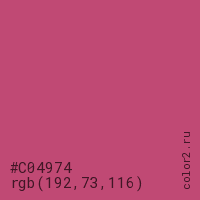 Цвет #C04974 в цветовой модели RGB обозначается тремя октетами (192, 73, 116) в десятичном формате и #C04974 в шестнадцатиричном (hex) формате, которые являются интенсивностью красного 192 (hex C0), интенсивность зелёного 73 (hex 49) и интенсивность синего 116 (hex 74).