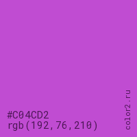 Цвет #C04CD2 в цветовой модели RGB обозначается тремя октетами (192, 76, 210) в десятичном формате и #C04CD2 в шестнадцатиричном (hex) формате, которые являются интенсивностью красного 192 (hex C0), интенсивность зелёного 76 (hex 4C) и интенсивность синего 210 (hex D2).