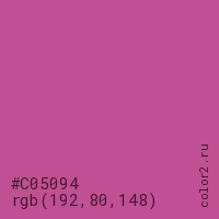 Цвет #C05094 в цветовой модели RGB обозначается тремя октетами (192, 80, 148) в десятичном формате и #C05094 в шестнадцатиричном (hex) формате, которые являются интенсивностью красного 192 (hex C0), интенсивность зелёного 80 (hex 50) и интенсивность синего 148 (hex 94).