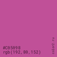 Цвет #C05098 в цветовой модели RGB обозначается тремя октетами (192, 80, 152) в десятичном формате и #C05098 в шестнадцатиричном (hex) формате, которые являются интенсивностью красного 192 (hex C0), интенсивность зелёного 80 (hex 50) и интенсивность синего 152 (hex 98).