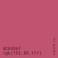 Цвет #C0536F в цветовой модели RGB обозначается тремя октетами (192, 83, 111) в десятичном формате и #C0536F в шестнадцатиричном (hex) формате, которые являются интенсивностью красного 192 (hex C0), интенсивность зелёного 83 (hex 53) и интенсивность синего 111 (hex 6F).