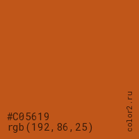 Цвет #C05619 в цветовой модели RGB обозначается тремя октетами (192, 86, 25) в десятичном формате и #C05619 в шестнадцатиричном (hex) формате, которые являются интенсивностью красного 192 (hex C0), интенсивность зелёного 86 (hex 56) и интенсивность синего 25 (hex 19).
