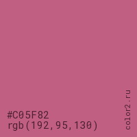 Цвет #C05F82 в цветовой модели RGB обозначается тремя октетами (192, 95, 130) в десятичном формате и #C05F82 в шестнадцатиричном (hex) формате, которые являются интенсивностью красного 192 (hex C0), интенсивность зелёного 95 (hex 5F) и интенсивность синего 130 (hex 82).