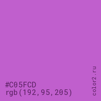 Цвет #C05FCD в цветовой модели RGB обозначается тремя октетами (192, 95, 205) в десятичном формате и #C05FCD в шестнадцатиричном (hex) формате, которые являются интенсивностью красного 192 (hex C0), интенсивность зелёного 95 (hex 5F) и интенсивность синего 205 (hex CD).