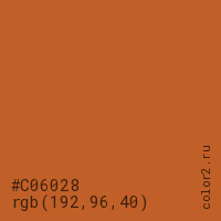 Цвет #C06028 в цветовой модели RGB обозначается тремя октетами (192, 96, 40) в десятичном формате и #C06028 в шестнадцатиричном (hex) формате, которые являются интенсивностью красного 192 (hex C0), интенсивность зелёного 96 (hex 60) и интенсивность синего 40 (hex 28).