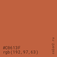 Цвет #C0613F в цветовой модели RGB обозначается тремя октетами (192, 97, 63) в десятичном формате и #C0613F в шестнадцатиричном (hex) формате, которые являются интенсивностью красного 192 (hex C0), интенсивность зелёного 97 (hex 61) и интенсивность синего 63 (hex 3F).