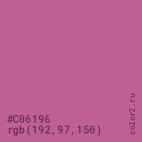 Цвет #C06196 в цветовой модели RGB обозначается тремя октетами (192, 97, 150) в десятичном формате и #C06196 в шестнадцатиричном (hex) формате, которые являются интенсивностью красного 192 (hex C0), интенсивность зелёного 97 (hex 61) и интенсивность синего 150 (hex 96).