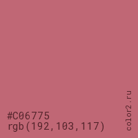 Цвет #C06775 в цветовой модели RGB обозначается тремя октетами (192, 103, 117) в десятичном формате и #C06775 в шестнадцатиричном (hex) формате, которые являются интенсивностью красного 192 (hex C0), интенсивность зелёного 103 (hex 67) и интенсивность синего 117 (hex 75).