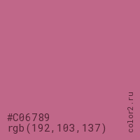 Цвет #C06789 в цветовой модели RGB обозначается тремя октетами (192, 103, 137) в десятичном формате и #C06789 в шестнадцатиричном (hex) формате, которые являются интенсивностью красного 192 (hex C0), интенсивность зелёного 103 (hex 67) и интенсивность синего 137 (hex 89).