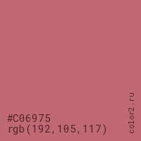 Цвет #C06975 в цветовой модели RGB обозначается тремя октетами (192, 105, 117) в десятичном формате и #C06975 в шестнадцатиричном (hex) формате, которые являются интенсивностью красного 192 (hex C0), интенсивность зелёного 105 (hex 69) и интенсивность синего 117 (hex 75).