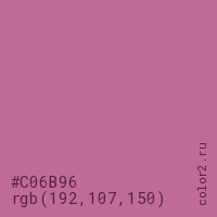 Цвет #C06B96 в цветовой модели RGB обозначается тремя октетами (192, 107, 150) в десятичном формате и #C06B96 в шестнадцатиричном (hex) формате, которые являются интенсивностью красного 192 (hex C0), интенсивность зелёного 107 (hex 6B) и интенсивность синего 150 (hex 96).