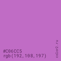 Цвет #C06CC5 в цветовой модели RGB обозначается тремя октетами (192, 108, 197) в десятичном формате и #C06CC5 в шестнадцатиричном (hex) формате, которые являются интенсивностью красного 192 (hex C0), интенсивность зелёного 108 (hex 6C) и интенсивность синего 197 (hex C5).