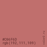 Цвет #C06F6D в цветовой модели RGB обозначается тремя октетами (192, 111, 109) в десятичном формате и #C06F6D в шестнадцатиричном (hex) формате, которые являются интенсивностью красного 192 (hex C0), интенсивность зелёного 111 (hex 6F) и интенсивность синего 109 (hex 6D).