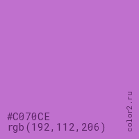 Цвет #C070CE в цветовой модели RGB обозначается тремя октетами (192, 112, 206) в десятичном формате и #C070CE в шестнадцатиричном (hex) формате, которые являются интенсивностью красного 192 (hex C0), интенсивность зелёного 112 (hex 70) и интенсивность синего 206 (hex CE).
