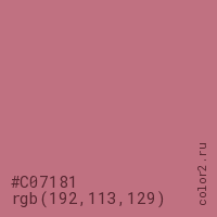Цвет #C07181 в цветовой модели RGB обозначается тремя октетами (192, 113, 129) в десятичном формате и #C07181 в шестнадцатиричном (hex) формате, которые являются интенсивностью красного 192 (hex C0), интенсивность зелёного 113 (hex 71) и интенсивность синего 129 (hex 81).