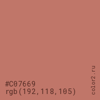 Цвет #C07669 в цветовой модели RGB обозначается тремя октетами (192, 118, 105) в десятичном формате и #C07669 в шестнадцатиричном (hex) формате, которые являются интенсивностью красного 192 (hex C0), интенсивность зелёного 118 (hex 76) и интенсивность синего 105 (hex 69).
