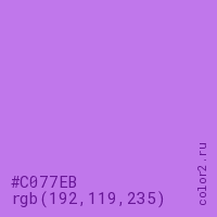 Цвет #C077EB в цветовой модели RGB обозначается тремя октетами (192, 119, 235) в десятичном формате и #C077EB в шестнадцатиричном (hex) формате, которые являются интенсивностью красного 192 (hex C0), интенсивность зелёного 119 (hex 77) и интенсивность синего 235 (hex EB).