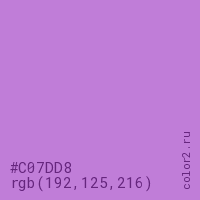 Цвет #C07DD8 в цветовой модели RGB обозначается тремя октетами (192, 125, 216) в десятичном формате и #C07DD8 в шестнадцатиричном (hex) формате, которые являются интенсивностью красного 192 (hex C0), интенсивность зелёного 125 (hex 7D) и интенсивность синего 216 (hex D8).