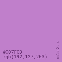 Цвет #C07FCB в цветовой модели RGB обозначается тремя октетами (192, 127, 203) в десятичном формате и #C07FCB в шестнадцатиричном (hex) формате, которые являются интенсивностью красного 192 (hex C0), интенсивность зелёного 127 (hex 7F) и интенсивность синего 203 (hex CB).