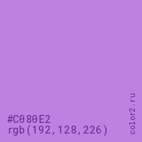 Цвет #C080E2 в цветовой модели RGB обозначается тремя октетами (192, 128, 226) в десятичном формате и #C080E2 в шестнадцатиричном (hex) формате, которые являются интенсивностью красного 192 (hex C0), интенсивность зелёного 128 (hex 80) и интенсивность синего 226 (hex E2).