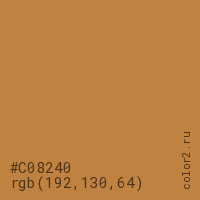 Цвет #C08240 в цветовой модели RGB обозначается тремя октетами (192, 130, 64) в десятичном формате и #C08240 в шестнадцатиричном (hex) формате, которые являются интенсивностью красного 192 (hex C0), интенсивность зелёного 130 (hex 82) и интенсивность синего 64 (hex 40).