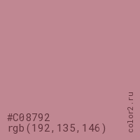 Цвет #C08792 в цветовой модели RGB обозначается тремя октетами (192, 135, 146) в десятичном формате и #C08792 в шестнадцатиричном (hex) формате, которые являются интенсивностью красного 192 (hex C0), интенсивность зелёного 135 (hex 87) и интенсивность синего 146 (hex 92).
