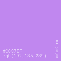 Цвет #C087EF в цветовой модели RGB обозначается тремя октетами (192, 135, 239) в десятичном формате и #C087EF в шестнадцатиричном (hex) формате, которые являются интенсивностью красного 192 (hex C0), интенсивность зелёного 135 (hex 87) и интенсивность синего 239 (hex EF).