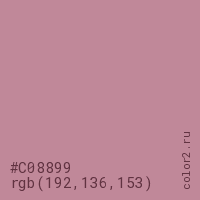 Цвет #C08899 в цветовой модели RGB обозначается тремя октетами (192, 136, 153) в десятичном формате и #C08899 в шестнадцатиричном (hex) формате, которые являются интенсивностью красного 192 (hex C0), интенсивность зелёного 136 (hex 88) и интенсивность синего 153 (hex 99).