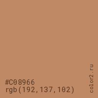 Цвет #C08966 в цветовой модели RGB обозначается тремя октетами (192, 137, 102) в десятичном формате и #C08966 в шестнадцатиричном (hex) формате, которые являются интенсивностью красного 192 (hex C0), интенсивность зелёного 137 (hex 89) и интенсивность синего 102 (hex 66).