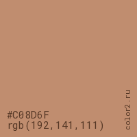 Цвет #C08D6F в цветовой модели RGB обозначается тремя октетами (192, 141, 111) в десятичном формате и #C08D6F в шестнадцатиричном (hex) формате, которые являются интенсивностью красного 192 (hex C0), интенсивность зелёного 141 (hex 8D) и интенсивность синего 111 (hex 6F).