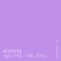 Цвет RGB(192, 144, 235) в процентом отношении количества цвета состоит из 75.3% красного (red), 56.5% зелёного (green) и 92.2% синего (blue).