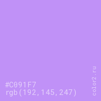 Цвет #C091F7 в цветовой модели RGB обозначается тремя октетами (192, 145, 247) в десятичном формате и #C091F7 в шестнадцатиричном (hex) формате, которые являются интенсивностью красного 192 (hex C0), интенсивность зелёного 145 (hex 91) и интенсивность синего 247 (hex F7).