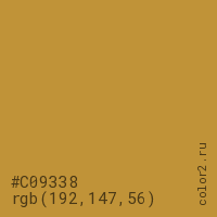 Цвет #C09338 в цветовой модели RGB обозначается тремя октетами (192, 147, 56) в десятичном формате и #C09338 в шестнадцатиричном (hex) формате, которые являются интенсивностью красного 192 (hex C0), интенсивность зелёного 147 (hex 93) и интенсивность синего 56 (hex 38).