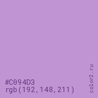 Цвет #C094D3 в цветовой модели RGB обозначается тремя октетами (192, 148, 211) в десятичном формате и #C094D3 в шестнадцатиричном (hex) формате, которые являются интенсивностью красного 192 (hex C0), интенсивность зелёного 148 (hex 94) и интенсивность синего 211 (hex D3).