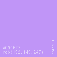 Цвет #C095F7 в цветовой модели RGB обозначается тремя октетами (192, 149, 247) в десятичном формате и #C095F7 в шестнадцатиричном (hex) формате, которые являются интенсивностью красного 192 (hex C0), интенсивность зелёного 149 (hex 95) и интенсивность синего 247 (hex F7).