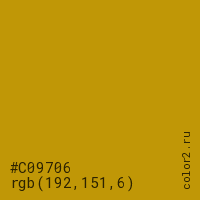 Цвет #C09706 в цветовой модели RGB обозначается тремя октетами (192, 151, 6) в десятичном формате и #C09706 в шестнадцатиричном (hex) формате, которые являются интенсивностью красного 192 (hex C0), интенсивность зелёного 151 (hex 97) и интенсивность синего 6 (hex 06).