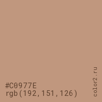 Цвет #C0977E в цветовой модели RGB обозначается тремя октетами (192, 151, 126) в десятичном формате и #C0977E в шестнадцатиричном (hex) формате, которые являются интенсивностью красного 192 (hex C0), интенсивность зелёного 151 (hex 97) и интенсивность синего 126 (hex 7E).