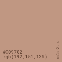 Цвет #C09782 в цветовой модели RGB обозначается тремя октетами (192, 151, 130) в десятичном формате и #C09782 в шестнадцатиричном (hex) формате, которые являются интенсивностью красного 192 (hex C0), интенсивность зелёного 151 (hex 97) и интенсивность синего 130 (hex 82).