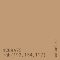 Цвет #C09A75 в цветовой модели RGB обозначается тремя октетами (192, 154, 117) в десятичном формате и #C09A75 в шестнадцатиричном (hex) формате, которые являются интенсивностью красного 192 (hex C0), интенсивность зелёного 154 (hex 9A) и интенсивность синего 117 (hex 75).
