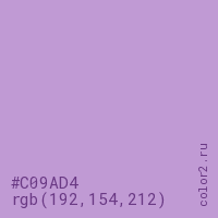 Цвет #C09AD4 в цветовой модели RGB обозначается тремя октетами (192, 154, 212) в десятичном формате и #C09AD4 в шестнадцатиричном (hex) формате, которые являются интенсивностью красного 192 (hex C0), интенсивность зелёного 154 (hex 9A) и интенсивность синего 212 (hex D4).