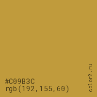 Цвет #C09B3C в цветовой модели RGB обозначается тремя октетами (192, 155, 60) в десятичном формате и #C09B3C в шестнадцатиричном (hex) формате, которые являются интенсивностью красного 192 (hex C0), интенсивность зелёного 155 (hex 9B) и интенсивность синего 60 (hex 3C).
