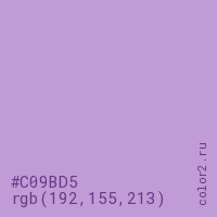 Цвет #C09BD5 в цветовой модели RGB обозначается тремя октетами (192, 155, 213) в десятичном формате и #C09BD5 в шестнадцатиричном (hex) формате, которые являются интенсивностью красного 192 (hex C0), интенсивность зелёного 155 (hex 9B) и интенсивность синего 213 (hex D5).