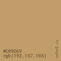 Цвет #C09D69 в цветовой модели RGB обозначается тремя октетами (192, 157, 105) в десятичном формате и #C09D69 в шестнадцатиричном (hex) формате, которые являются интенсивностью красного 192 (hex C0), интенсивность зелёного 157 (hex 9D) и интенсивность синего 105 (hex 69).