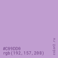 Цвет #C09DD0 в цветовой модели RGB обозначается тремя октетами (192, 157, 208) в десятичном формате и #C09DD0 в шестнадцатиричном (hex) формате, которые являются интенсивностью красного 192 (hex C0), интенсивность зелёного 157 (hex 9D) и интенсивность синего 208 (hex D0).